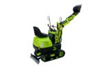 Miniexcavatorul ZIPPER ZI-MBGS600 cu motor pe benzină de 6.3kW și starter electric. Viteză de deplasare 1.7 km/h, forță de săpare 4.36 kN (braț) sau 8 kN (cupă), viteză de rotație 7.5 rpm. Include furcă pentru paleți, greblă și gheară